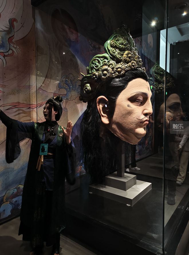 如果说第一层还只是克制的引子,第二层的展品则带来了非常强烈的视觉震撼。在“明邪正”区域,高达2.8米的灵吉菩萨头颅面前,有许多人抬头观望。