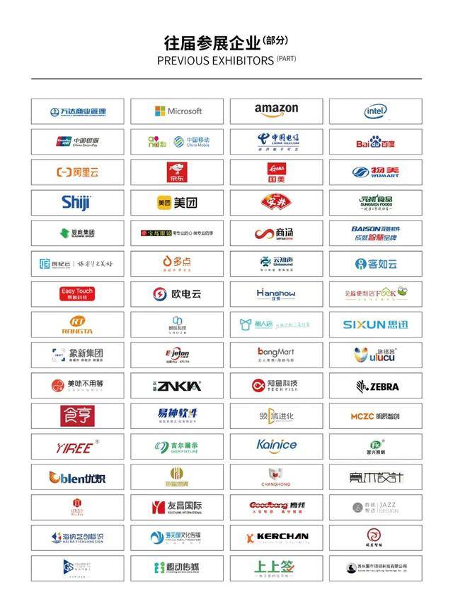 往届展会云集了万达、微软、亚马逊、英特尔、中国银联、中国移动、中国电信、百度、阿里云、京东、国美、物美、石基、美团、安井、元初、夏商、宝岛眼镜、商汤、多点、云知声、客如云、象新、见福等近1000家行业一线品牌企业。