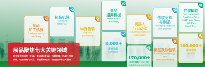 本次展会的展品范围极为广泛,涵盖七大关键领域:食品加工机械、食品通用机械、包装机械、机器人与自动化、包装材料与制品、标签及软包装、物流包装。具体展品包括肉类加工设备、果蔬加工设备、烘焙设备、乳制品加工设备、清洗设备、杀菌设备、干燥设备、包装设备、灌装设备、喷码机、标签设备、封口设备、pg电子游戏官方网站机器人应用以及各种包装材料及制品等。此外,展会还将聚焦环保包装材料和技术的展示,如MDO-PE单一材质、EVOH、TPVA高阻隔材料等,推动行业可持续发展。