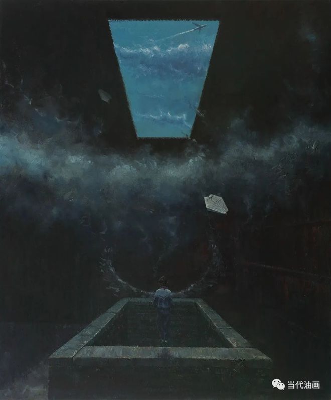 老蔡的画里,他个人梦境中不断被强化的童年意象:纸飞机、砖头砂土坦克、飞翔的幻象、迷宫一样的围屋、神秘的暮光等等,这些我们这代人的童年中耳熟能详的“玩法”,是那物质匮乏期的替代,也是孩童本真创造力的纪念碑。老蔡还有一些匪夷所思的故事把童年叙事集中地表现出来:穿越夜空的手电光柱照亮深林之内高树梢头的鸟窝;古宅门闪亮异常的后面是暗夜里各种妖怪出没之地;远山上的铁塔和老院中的古老香樟树都曾是无与伦比的圣殿;云彩如磐石板压在天空,又像是一个个漂浮着的巨大面包或是他幼时想象的天空之城。如此种种,是一个成熟男人对童年想象的回溯,也是其对生命源流的重构。老蔡探索着用西方超现实语言与诗境一样的图式混合,创作出与当下普遍流行的油画语言截然不同的画面,令人感动!