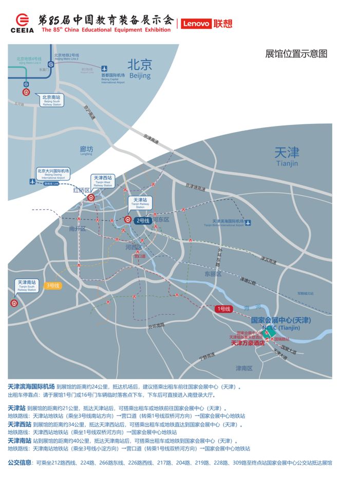 ⑵天津站:到展馆的距离约21公里,抵达后,可搭乘出租车或地铁前往国家会展中心(天津)。地铁路线号线南站方向)→营口道(转乘1号线双桥河方向)→国家会展中心。