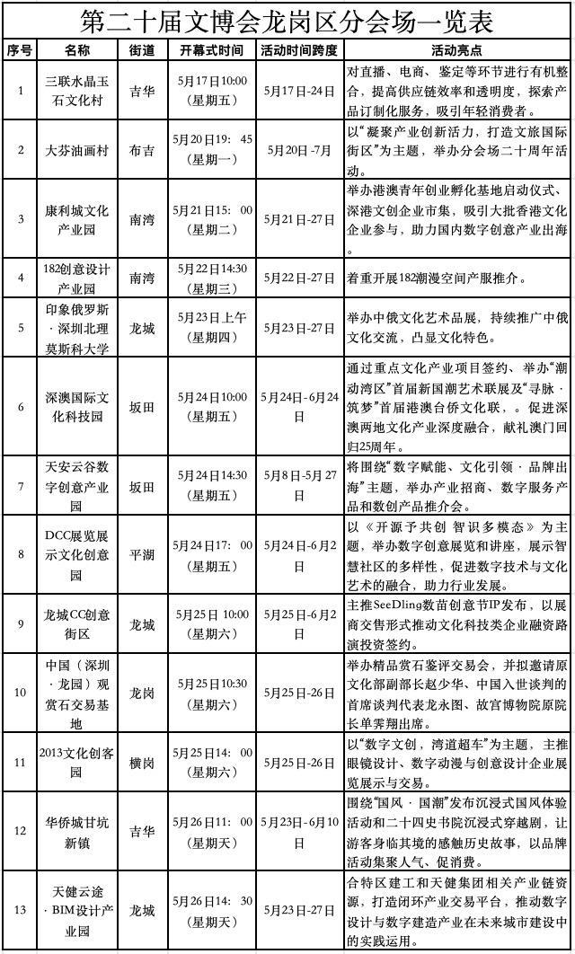 本届文博会全市设52家分会场,比上一届减少12家。龙岗区共13家分会场,连续14年位居全市第一。其中11家为老分会场,包括“20届元老”大芬油画村,两家为新申报成功的分会场,分别是龙城CC创意街区和康利城文化产业园。这些分会场的活动内容涵盖数字创意、动漫/游戏、工艺美术、文化旅游、文化会展、创意设计、教育文化等领域。
