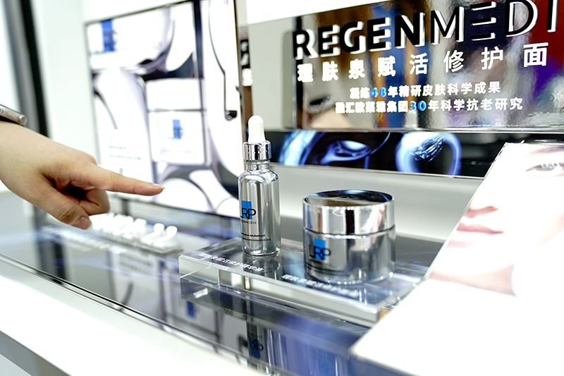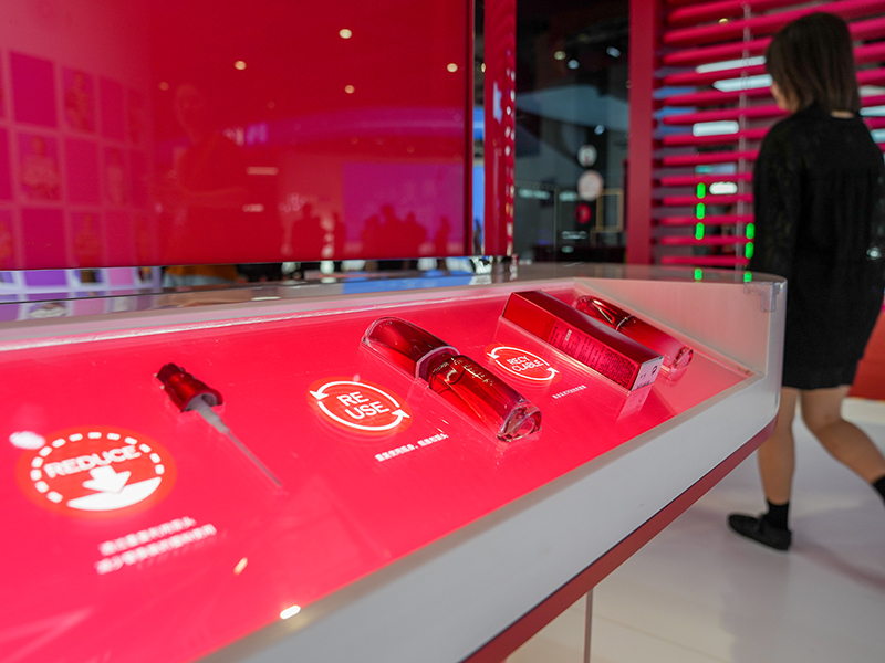 11月5日在第六届进博会消费品展区资生堂展台拍摄的红腰子空瓶。资生堂在进博会上首发首秀的“红腰子空瓶再续计划”,可让化妆品空瓶实现100%循环使用。