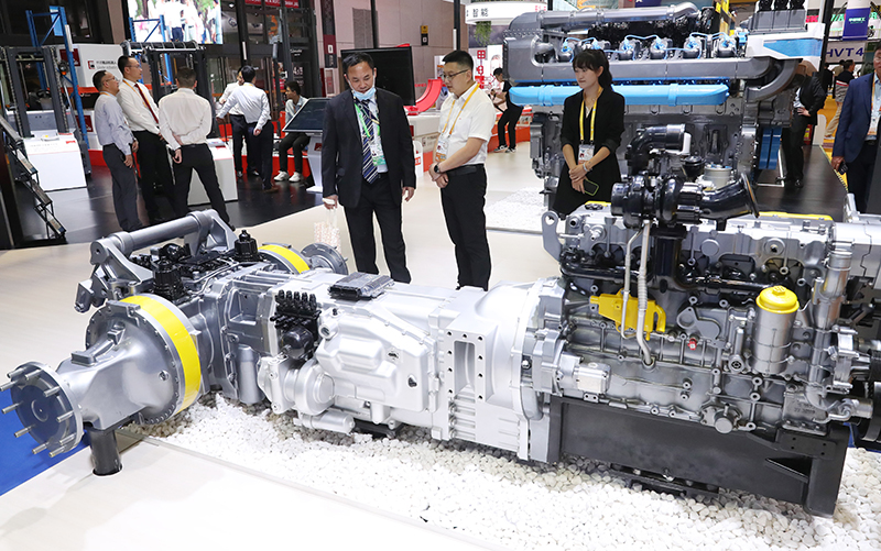 11月5日,参观者在第六届进博会林德公司展出的的大马力拖拉机CVT动力总成系统模型展品旁交流。