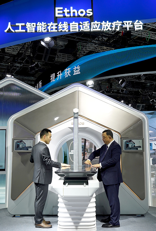 11月5日,在第六届进博会医疗器械及医药保健展区,瓦里安展台展出全球同步首发的第二代Ethos人工智能在线自适应放疗平台。