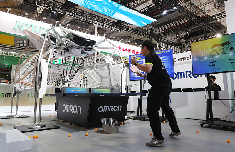 11月5日,工作人员(右)在第六届进博会上展示欧姆龙公司展出的第八代FORPHEUS乒乓球教练机器人。