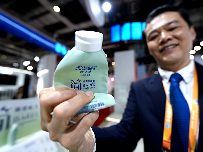 11月5日,在第六届进博会消费品展区宝洁展台,工作人员介绍在中国首次展出的一款新产品,可以将瓶身卷起来,用到空瓶不浪费。