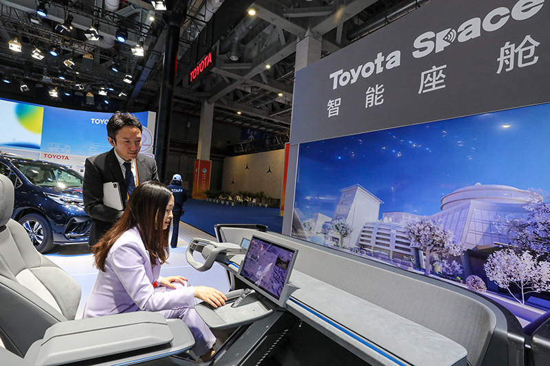 11月5日,工作人员(左二)在第六届进博会上向参观者介绍Unity公司全新推出的团结引擎车机套件。