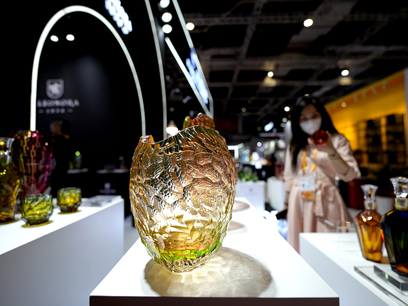 11月5日,在第六届进博会消费品展区HCK哈士奇冰吧展台,工作人员介绍首次展示的一款复古冰箱。